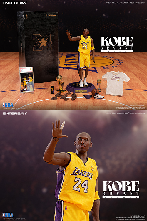 エンターベイの1/6フィギュアシリーズ「リアルマスターピース」で展開する、プロバスケットリーグの最高峰「NBA」のスタープレイヤーを放つフィギュアシリーズ「NBAコレクション」。世界で最も危険な猛毒蛇の一種"ブラックマンバ"の愛称を持ち、名門ロサンゼルス・レイカーズで絶対的エースとして活躍を見せたレジェンドプレイヤー、コービー・ブライアントが「24」の背番号を付け、NBAチャンピオン、NBAファイナルMVPに輝いた2010年の姿を、全世界3000セット限定アイテムとして1/6スケールで立体化。リアルで超精巧なコービー・ブライアントのノーマルな表情のヘッドは、過去のヘッドパーツに、新たにディテールを施した新規金型での製作。関節可動は30箇所以上となり、最高の可動性を実現するコービーの実際の身長に基づき1/6スケールで製作された素体を使用。コレクション用クリアケースに入った、個別のシリアルナンバー入り限定版レトロ3Dホログラム印刷の証明書が付属。
