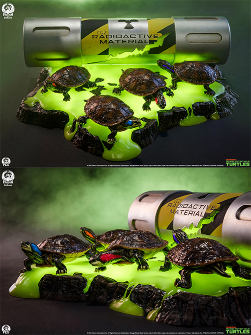 1984年、ケヴィン・イーストマン&ピーター・レアードの手により誕生し、その後アニメ、ゲーム、映画などなど世界中多くの人たちを虜にしてきたタートルズたち。そのタートルズたちの原点ともいえるミュータンジェンに触れミューテーションするまさに「オリジン」の瞬間をサイドショウ×PCS(プレミアムコレクティブルズスタジオ)がリアリティーあふれるジオラマスタチューとして表現。破損したキャニスターから溢れ出るミュータンジェンは、LEDライトアップギミック搭載で怪しく光出します。4匹それぞれの特徴も反映させた亀たちにも注目です。