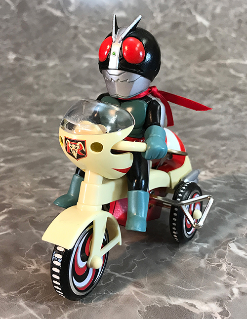 『仮面ライダー』に登場するキャラクターたちが、懐かしくレトロなゼンマイ式三輪車に乗ったソフビフィギュアで登場!こちらは再び登場となる「仮面ライダー旧2号」。デフォルメもキュートなフィギュアながらも、そのキャラクターの特徴を細部まで造型で表現されています。三輪車はゼンマイを回し走行が可能。車輪も可動。おりん部分がチリンチリンと音が鳴ります。昔懐かしきスタイルが逆に新鮮にうつるノスタルジーあふれるアイテム。