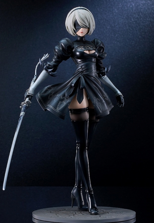 アニメ『NieR Automata Ver1.1a』より「2B」ヨルハ二号B型が1/7スケールでフィギュア化となりました。「白の契約」を携え真っ直ぐにこちらを見据える凛とした立ち姿で立体化。ふわっと広がるドレープスカートやボリュームのある袖が特徴的な衣装は細部まで丁寧に造形。黒色の下地にシルバーを使うことで独特な光の反射まで再現しました。また衣装とは対称的な白い素肌や、胸元、太腿の透け感のある塗装も、質感を感じていただけるようこだわり抜いて仕上げています。さらに差し替えパーツとしてゴーグルを外した表情パーツも付属。
