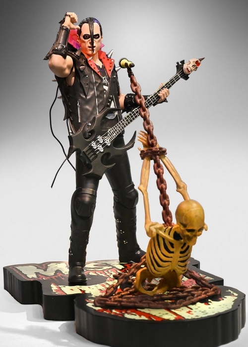 様々なミュージシャンのアイテムをリリースする、漢気あふれるロックなメーカー「ナックルボンズ」。その中でも人気の高いスタチューシリーズ「ロックアイコンズ」から、1970年代後半からハードコア・パンクシーンを牽引するバンド「ミスフィッツ」の存在感抜群のベーシスト「ジェリー・オンリー」が登場です。印象的なガイコツのスタンドマイクも造り込まれています。全世界3000体限定の、ロックファンに贈るコレクターアイテム!