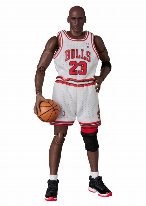 メディコム・トイがおくる史上最強のアクションフィギュアシリーズ「マフェックス(MAFEX)」。全高約15センチレベルのボディに新規設計のジョイントパーツを設置し、ディスプレイしやすく大胆なポージングも可能!MAFEXシリーズ100体目に選ばれたNBAのレジェンド、「MJ」マイケル・ジョーダン。今回はシカゴブルズのホームユニフォーム(#23)を着用した、1995年頃の姿のジョーダンを再現しました。MAFEXではおなじみとなった布製コスチュームに、頭部は差し替えで全2種、スポルディング刻印もあるバスケットボール、可動式フィギュアスタンドも付属し、様々なポージングが可能です。そしてバスケットシューズはAJ11、黒赤の通称「BRED」がセレクトされました!