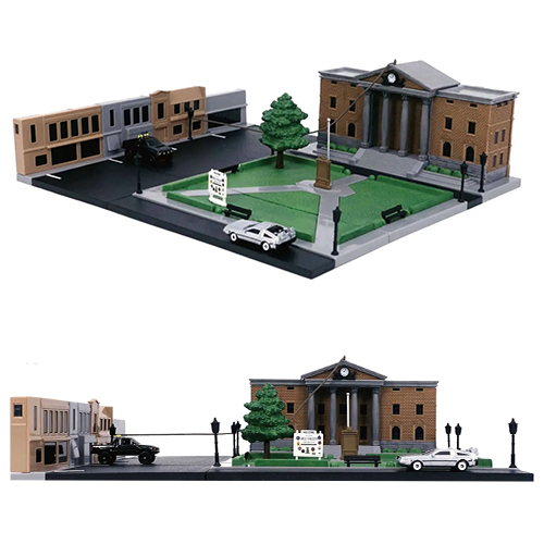 ミニカーメーカーとして数々の名車をモデル化するジャダトイズから、映画に登場した車たちをミニチュアモデル化する「ハリウッドライダーズ」のスピンオフ!スケールを小さくし、リーズナブルなプライスながらもジオラマ仕立てのベースとセットとなった「ナノハリウッドライダーズ」。こちらは映画『バック・トゥ・ザ・フューチャー』から舞台となるヒルバレーの"あの時計台"を中心とした「コートハウス・スクエア」!ミニチュアサイズのデロリアンとトヨタSRSピックアップの2台も付属しちゃいます。