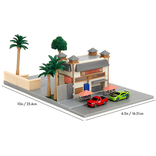ミニカーメーカーとして数々の名車をモデル化するジャダトイズから、映画に登場した車たちをミニチュアモデル化する「ハリウッドライダーズ」のスピンオフ!スケールを小さくし、リーズナブルなプライスながらもジオラマ仕立てのベースとセットとなった「ナノハリウッドライダーズ」。こちらは映画『ワイルド・スピード』からドミニクとミアが経営するお店「Toretto's Market & Cafe」。ミニチュアサイズのミニカーも2台付属して雰囲気満点!