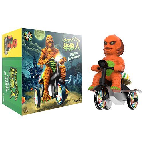 懐かしき70年代ごろに日本で特撮やアニメキャラクターを乗せたブリキ製の三輪車のおもちゃがリリースされていましたが、そんなスタイルをオマージュしたスーパー7の新シリーズ「スーパーサイクルズ」が誕生!こちらは、1954年に公開となった映画『大アマゾンの半魚人』のギルマンがハロウィンカラーで三輪車にまたがる、なんともシュールかつキュートな素敵なアイテム!当時のベルもしっかりとオマージュされレトロ感漂う素敵なアイテムになっています。