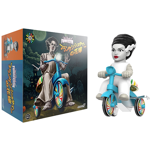 懐かしき70年代ごろに日本で特撮やアニメキャラクターを乗せたブリキ製の三輪車のおもちゃがリリースされていましたが、そんなスタイルをオマージュしたスーパー7の新シリーズ「スーパーサイクルズ」が誕生!こちらは、1935年公開の映画『フランケンシュタインの花嫁』のブライドが三輪車にまたがる、なんともシュールかつキュートな素敵なアイテム!当時のベルもしっかりとオマージュされレトロ感漂う素敵なアイテムになっています。