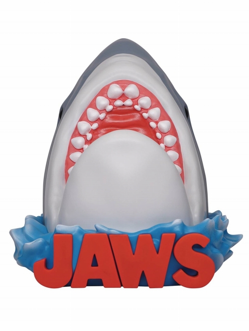 バストバンクやペーパーウェイトをリリースするモノグラムから新作が登場です。スティーヴン・スピルバーグの出世作とも言える、1975年の映画『JAWS/ジョーズ』から!フィギュア型バンクとしてセレクトされたのは、もちろんこいつ!凶悪サメの通称「ブルース」!有名な映画ポスターをイメージした、海面から頭ザバーンした姿でのバンク化(あのポスターは水中でしたが)。これですよ、イメージぴったりのビジュアルモチーフに、ほどよいデフォルメに、実用性もプラスした、隙のない仕様。