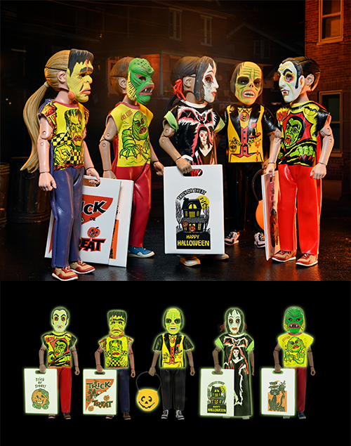 1950~80年代にかけて販売されていた、子供向けのハロウィン衣装の人気メーカー「ベン・クーパー」。そのベン・クーパーが手掛けたコスチュームたちをモチーフとしたネカの「ベン・クーパー コスチュームキッズコレクション」。シリーズ1、2にラインナップし人気の高かった、クリーチャー、ドラキュラ、フランケンシュタイン、ファントム、ヴァンパイアガールの5人のキッズたちが、みんな大好き「グロウ・イン・ザ・ダーク」仕様になってカムバック!ベン・クーパーのデザインをイメージしたマスクやコスチュームの、ビニール風な雰囲気や、敢えてのチープ感まで再現し、それぞれにキャンディバッグも付属。アメリカンホラーカルチャーをリスペクトした素敵なアイテム。当時のオリジナルのパッケージをオマージュした、レトロスタイルのウィンドウボックス仕様ボックスも注目!