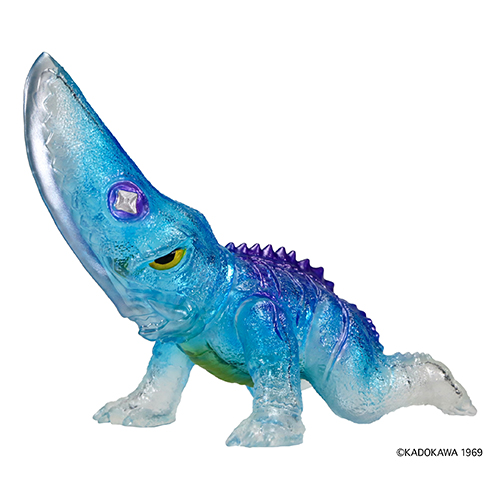 CCPミドルサイズでガメラシリーズに、1969年の『ガメラ対大悪獣ギロン』より、その包丁のような頭部や四つ足の体型など独特のフォルムで人気のギロンが初登場!こちらは、劇中のギロンをイメージしたスタンダードVer.に対し、ソフビの美しさを前面に出した「クリアブルーVer.」。透明度の高いクリア成形にクリアブルーが彩色された、ギロンらしさもありレトロソフビらしさもある美しいカラーリング。背中などに吹かれたメタリックパープル・お腹に吹かれたゴールドなどがその色合いをさらに引き立てます。透明で美しい包丁のような頭部は、クリアソフビだからこそ楽しめる質感に!