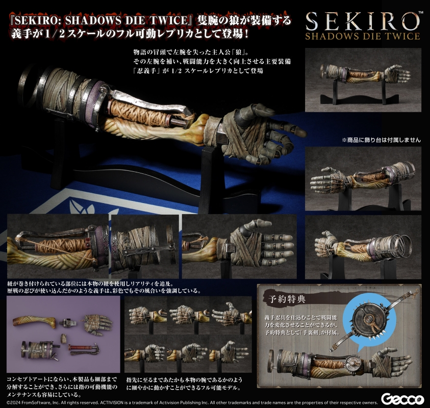 指先に至るまであたかも本物の腕であるかのように細やかに動かすことができるフル可動モデル。歴戦の忍びが使い込んだかのような義手は、彩色でもその風合いが強調され、紐が巻き付けられている部位には本物の紐を使用しリアリティを追及したアイテム。さらに、コンセプトアートにならい、本製品も細部まで分解することができ、指の可動機能のメンテナンスも容易出来る様な仕様に!ゲーム内で義手忍具を仕込むことで戦闘能力を変化させることができるのにならい、なんと予約特典として「手裏剣」が付属するファンにとって嬉しいポイントも。