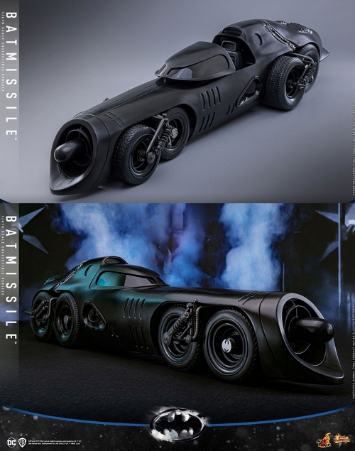 ホットトイズのムービーマスターピースのビークルシリーズから、1992年公開のティム・バートン映画『Batman Returns』に登場するバットミサイルがラインナップです。バットモービルに組み込まれた脱出機能を発動した姿「バットミサイル」を、全長約109センチのフィギュアとして立体化。実車さながらの塗装で、メカニカルなデザインや特徴的な8つのホイール、傷や汚れまでをウェザリング仕上げなど、細部まで余すことなく再現。外側に展開可能な前後方の1組ずつ(計4つ)のホイール、。スライド開閉のキャノピーなどのギミック内蔵で、同スケールのバットマンが搭乗可能。ダッシュボードとエンジン部にはLEDを内蔵し、劇中のように炎が出るようなエフェクトが演出可能。