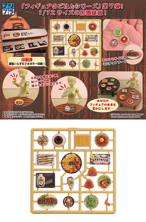 1/12フィギュアのごはんシリーズから、居酒屋飯をテーマに居酒屋の定番メニューからちょっと豪華なおつまみまで、様々な酒の肴を再現したミニチュアセット。お好みのフィギュアと組み合わせれば様々なシチュエーションを表現可能!セット内容は唐揚げ&フライドポテト盛合せ、たこぶつ、枝豆、ししゃも、ユッケ、しめ鯖、ウニ、焼きおにぎり、生牡蠣、生牡蠣皿、もつ煮、もつ煮用どんぶり、手羽先、手羽先盛合せ皿、馬レバ刺し!はらぺこなフィギュアたちにぜひ美味しい居酒屋飯を!